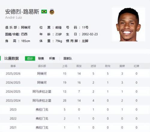 我是真佩服阿马多拉之星的眼光,穆帅冬窗首签卡布拉尔,是人家从德丙免签的。而这个安德烈-路易斯,是三年前从巴西弗拉门戈租借来的,当时还只有20岁,一个赛季后发现靠谱,就60万欧元买下,又一年后220万欧元转手给里奥阿维,合同签到2029年。如今也被穆里尼奥相中,不知道是缘分,还是选材标准契合。